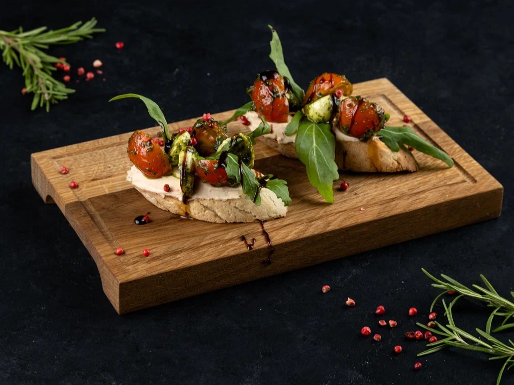 Брускетта Капрезе: чиабатта, творожный сыр, соус свит-чили, сыр моцарелла, черри, мятный соус, крем бальзамик, руккола.