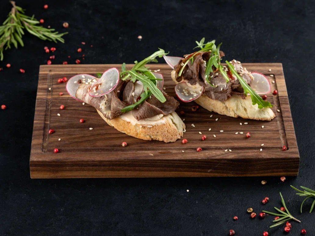 Брускетта с ростбифом и кунжутным соусом