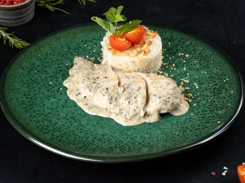 Куриная грудка су-вид, пряный рис с перцем чили и имберем, соус из белых грибов,сливки.