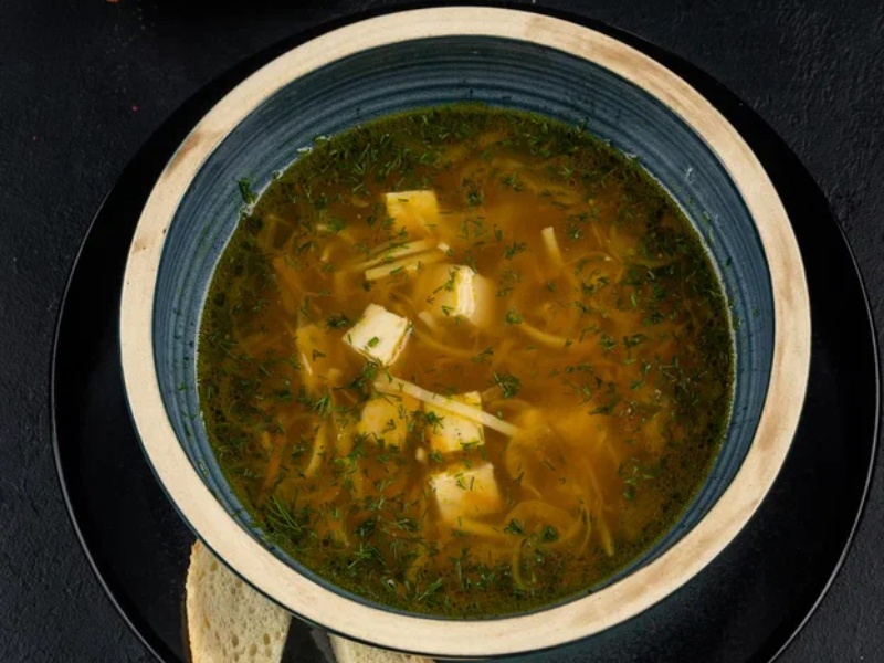 лапша яичная, пассеровка, куриное филе, бульон, укроп,чиабатта.