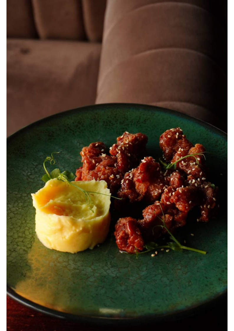 куриное бедро в панировке под соусом свит-чили с картофельным пюре