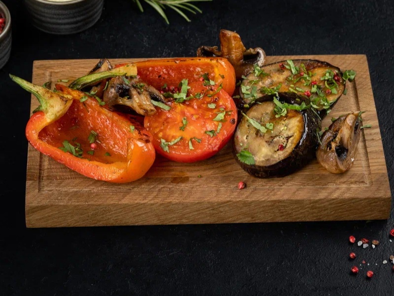 грибы, помидоры, перец болгарский, баклажан, чесночное масло, зелень