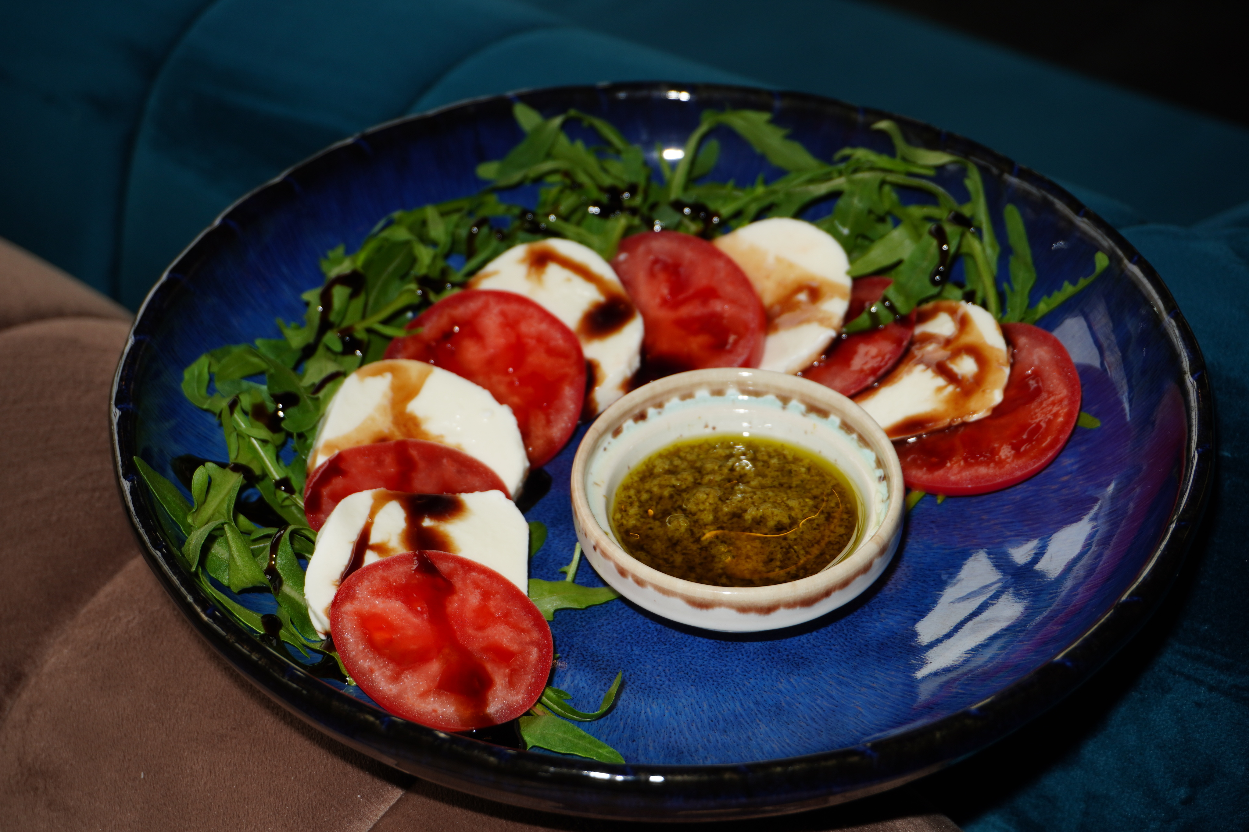 моцарелла, розовые томаты, руккола, соус песто, соус бальзамик