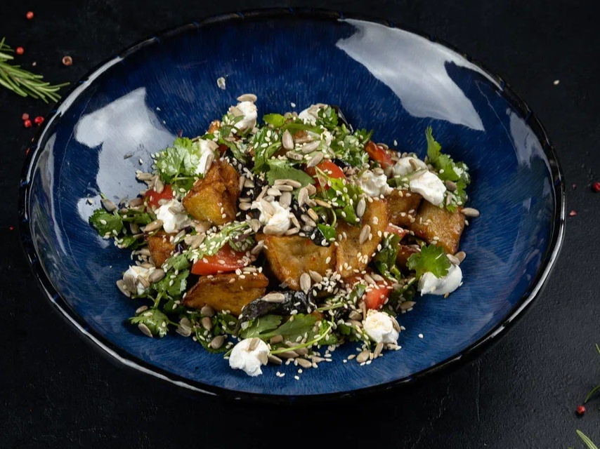 хрустящие баклажаны, крем-чиз, кинза, соус свит-чили, кунжутное масло, розовые томаты, микс салата, кунжут, семечки подсолнечника