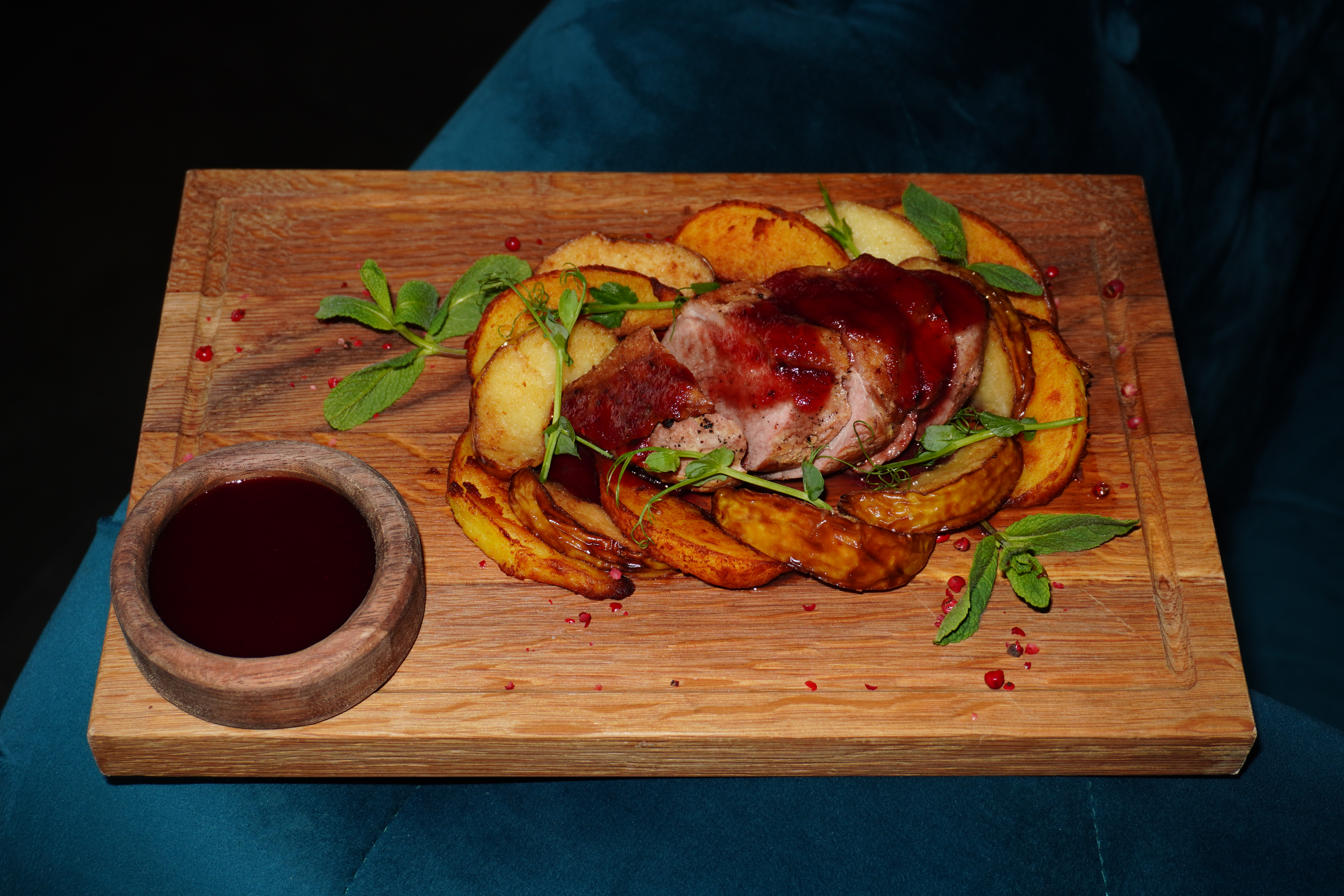 Утиная грудка, ягодный соус, печеные яблоки, печеный картофель